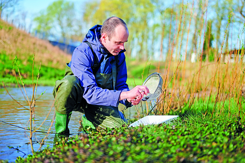 Ortswechsel. Es geht einige Kilometer flussabwärts. Hier befindet sich die neue Emscher-Aue im Holtener Bruch in Oberhausen – zumindest künftig. Noch ist die Emscher hier ein enger Kanal. Bald soll sie wachsen, Platz bekommen, wieder ein richtiger Fluss werden – samt Auenlandschaft. Vögel sollen sich ansiedeln, ebenso wie Insekten, Reptilien, Amphibien. Und es wird ein wichtiger Ort für den Hochwasserschutz. Denn der Fluss wird hier bei Starkregen zwar deutlich über seine Ufer treten, die Wiese nimmt das Wasser aber auf und verhindert Überschwemmungen an anderer Stelle. Feuchtgebiete können Kohlendioxid im Boden speichern. Grüne Ökosysteme bieten darüber hinaus Naherholungsräume, die sowohl in dichtbesiedelten wie auch in landwirtschaftlich geprägten Regionen von den Menschen wertgeschätzt werden. „Es wird ein perfektes Zusammenspiel zwischen dem, was die Natur braucht, und den Belangen der Menschen“, erklärt Dr. Sebastian Birk. Er ist ebenfalls Aquatischer Ökologe an der UDE – und Koordinator des EU-geförderten Projekts.