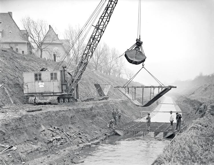 Ein Blick zurück – zum Ende des 19. Jahrhunderts. Das Ruhrgebiet steckt mitten in der Industrialisierung. Stahl und Kohle sind wichtige Treiber der Wirtschaft, immer mehr Menschen strömen zum Arbeiten und Leben ins Revier. Doch wohin mit dem Abwasser? Unterirdische Kanäle sind unmöglich, da es durch die Arbeit unter Tage immer wieder zu Absenkungen der Erde kommt. Das Abwasser muss also oberhalb abgeführt werden. In den Fluss? Doch dieser tritt immer wieder über die Ufer. Das Schmutzwasser überschwemmt die Städte – und damit breiten sich auch Krankheiten wie Typhus oder Cholera aus. Die einzige Lösung: Die Emscher muss selbst zum Abwasserkanal umgebaut, das heißt, auch mit Betonwannen begradigt werden. Ab 1899 fließen nun offiziell Fäkalien aus den Haushalten, aber auch giftige Chemikalien aus der Industrie in den einst naturnahen Lauf – mitten in Deutschland. „Es gab so gut wie kein Leben mehr im Wasser außer einigen Bakterien“, so Grabner.