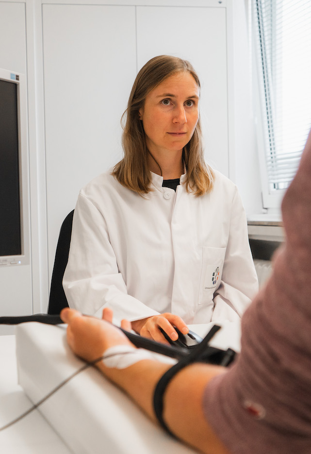 Das eine Bein locker über das andere geschlagen und mit dem Fuß wippend, sitzt der etwa 20-jährige Proband der Ärztin gegenüber am Tisch. Auf einem stützenden Keilkissen liegt sein Unterarm, an dessen Innenseite ein spielkartengroßes Gerät befestigt ist.