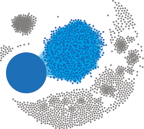 B-Zellen sind die Antikörperfabriken des Körpers. Jede gebildete B-Zelle trägt eine individuelle Sequenz des B-Zell-Rezeptors (BZR), die sie nur mit ihren durch Zellteilung entstandenen Nachkommen teilt. Da bei einem bösartigen Lymphom alle Zellen von einer einzigen entarteten Zelle abstammen, tragen folglich alle Tumorzellen die gleiche BZR-Sequenz. Die Grafik zeigt das BZR-Repertoire eines solchen Lymphoms. Jeder Kreis steht für eine Anzahl an Zellen mit identischem BZR – je größer der Kreis, desto mehr Zellen tragen den gleichen Rezeptor. Der große blaue Kreis repräsentiert eine dominante Population von Zellen mit identischer BZR-Sequenz. Hier ist also eine einzelne Zelle dramatisch expandiert und lässt auf einen bösartigen Vorgang schließen. Ebenfalls blau eingefärbt sind einzelne Sequenzen, die zwar nicht identisch, allerdings der Tumor-Sequenz so ähnlich sind, dass sie zur Krebs-Population gehören. Die grauen Kreise stehen ebenfalls für individuelle BZR-Sequenzen, sie symbolisieren daher gesunde Zellen.