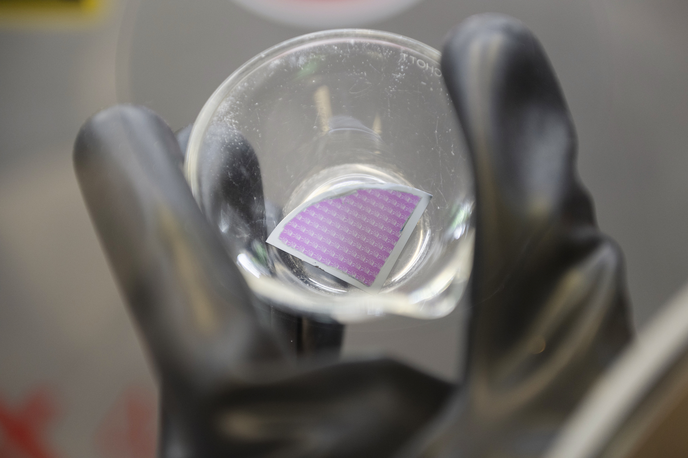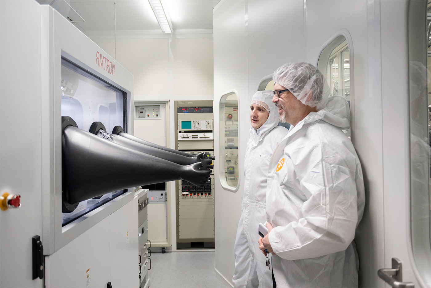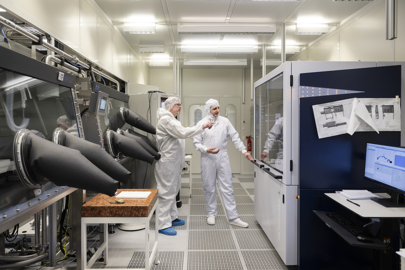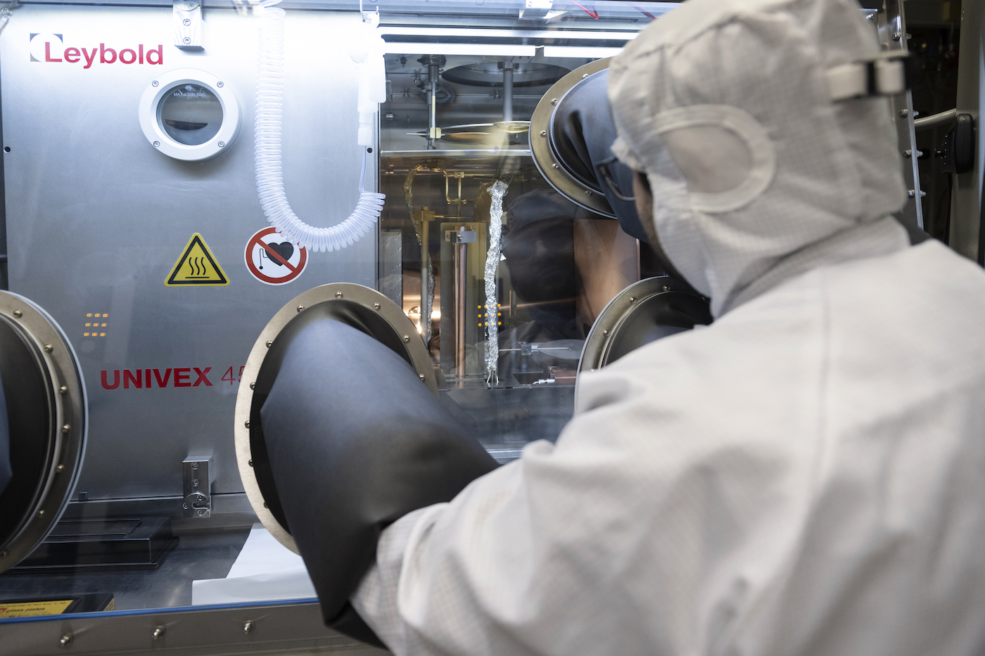 Direkt gegenüber dem Röntgengerät (Bild 6), das sich die Forscher gerade anschauen, befindet sich die speziell angefertigte Metall-Beschichtungsanlage (l.), in die die Waferstücke eingelegt werden. Der Luftsauerstoff stört den Prozess – deswegen können die Wissenschaftler:innen wie Doktorand Enes Mutlu in die Anlage auch nur über integrierte Handschuhe eingreifen (Bild 7). In einer Stickstoffatmosphäre werden die Wafer mit Metall bedampft – so entstehen stromleitende Kontakte auf dem Chip.