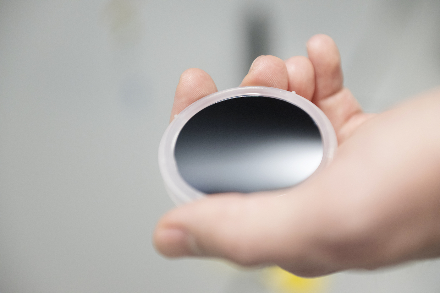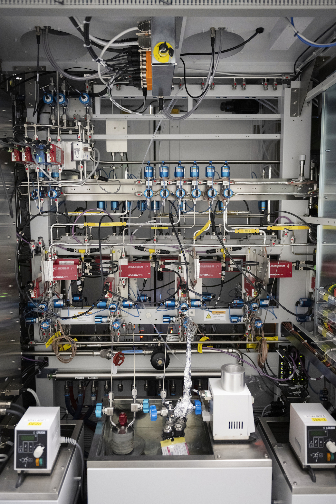 Die Halbleiterproduktion beginnt in den Reinräumen des ZHO – genauer: in der Epitaxieanlage, die von Doktorand Alexander Poßberg bedient wird (Bild 1). Hier wird ein Wafer aus Indiumphosphid eingelegt. „Üblicherweise bestehen Wafer in der Chiptechnologie aus Silizium, aber unser Halbleitermaterial eignet sich besser für höchste Frequenzen“, erklärt Weimann. Diese Wafer sind das Gerüst, die Grundplatte der Chips, die hundertfach auf einem Wafer entstehen. Auf der hauchdünnen, runden Scheibe, die etwa handtellergroß ist, werden im sogenannten Epitaxieverfahren spezielle Kristallschichten aufgetragen. Über den Wafer wird dabei ein Gas geleitet, das zunächst individuell gemischt wird (Bild 2). Unter Wärmeeinwirkung zersetzt es sich in einzelne Atome, die sich – Lage für Lage – auf den Wafer legen. Über die Konzentration der Moleküle im Gasstrom kann die Kristallzusammensetzung eingestellt werden. Das alles wird am Computer gesteuert. Der Wafer besteht nun aus mehr als 30 Schichten verschiedener Materialien, von denen einige nur wenige Nanometer dick sind (Bild 3).