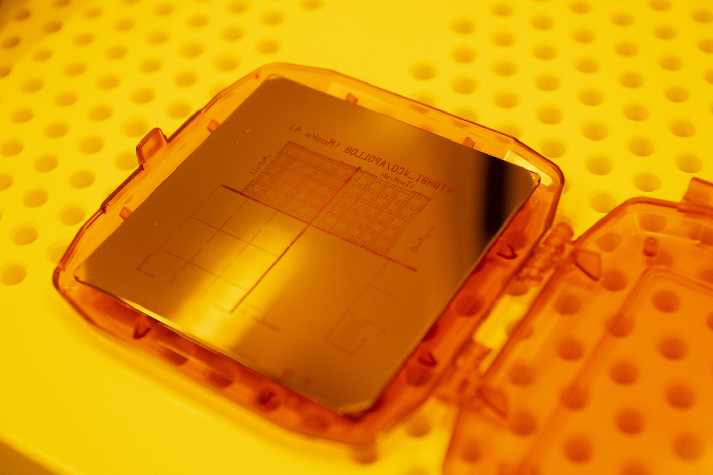 Sind die Analyse-Ergebnisse vielversprechend, folgt die Fotolithografie, mit der mikroskopisch kleine Strukturen auf der Wafer-Oberfläche geschaffen werden. Dazu wird eine lichtempfindliche Schicht auf die Wafer aufgebracht und anschließend durch verschiedene Fotomasken (Bild 5) belichtet. Die Masken bestehen aus Glas mit einer Chromschicht, in die Öffnungen eingearbeitet sind. Mit dieser Methode kann eine Struktur auf beliebig vielen Wafern wiederholt werden, ähnlich der Lithografie, die aus dem Buchdruck bekannt ist. In 10 bis 20 Produktionsschritten entsteht die notwendige Struktur auf dem Wafer, um einzelne Bauelemente durch Ätzverfahren zu isolieren und mit Metallkontakten zu versehen. Mit UV-Belichtung lassen sich so Strukturen um einen Mikrometer – ein Hundertstel des Durchmessers eines Haars – herstellen. „Es geht aber noch hundertmal kleiner: mit unserer neuen Elektronenstrahllithografie können wir Strukturen mit unter zehn Nanometer Größe definieren. Das sind ungefähr 25 Atomabstände im Kristall oder ein Zehntausendstel eines Haardurchmessers“, sagt Weimann.