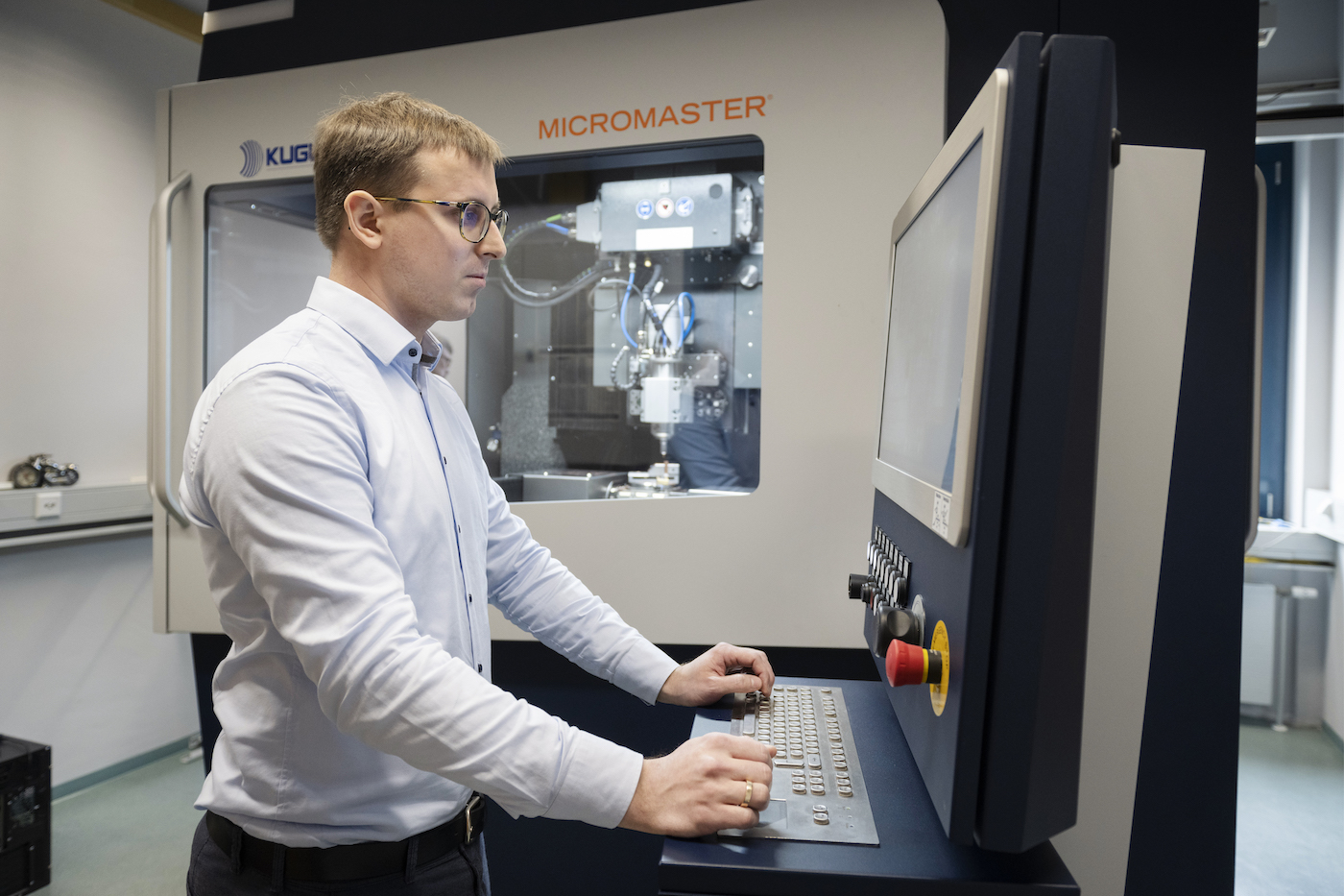 Hier kann Doktorand Konrad Müller nun mittels 3D-Plan das gewünschte Modell des Moduls erstellen und in der Fräse umsetzen (Bild 14). „Mit der Mikropräzisionsfräse können wir schmale Gräben in einer Breite von 100 bis 300 Mikrometern in Metallblöcke einbringen, also so breit wie ein bis drei Haare“, erklärt Weimann.