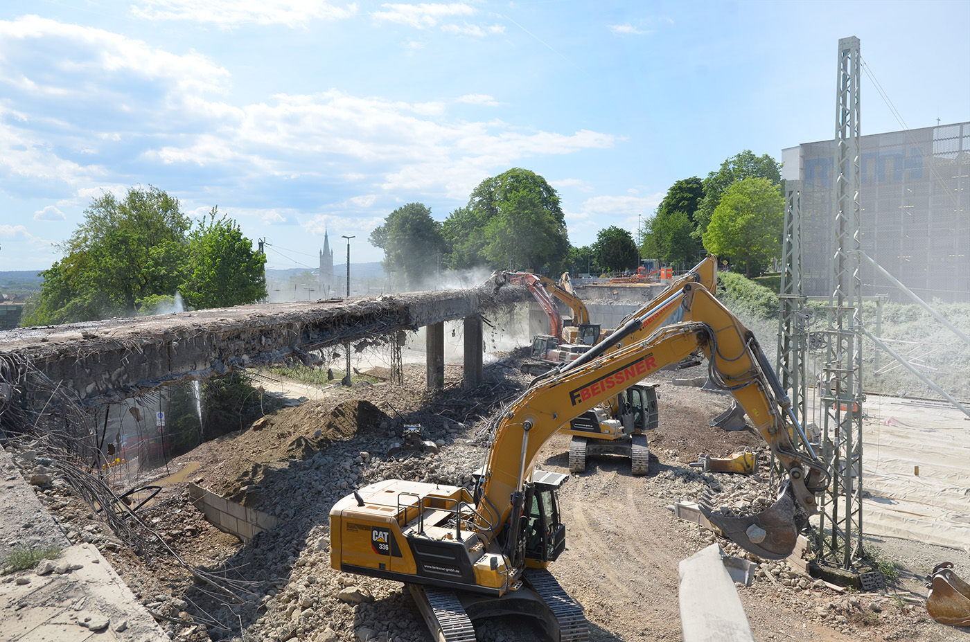 40.000 Tonnen Material fielen beim Abbruch der Aachener Brücke Turmstraße an. Das Team von Up-Cement begleitete den Abriss vor Ort, begutachtete die eingesetzten Geräte und verlud anschließend insgesamt 40 Tonnen des nahezu sortenreinen Betons zum Transport in die Labore in Essen und Freiberg. | © Susanne Helmich