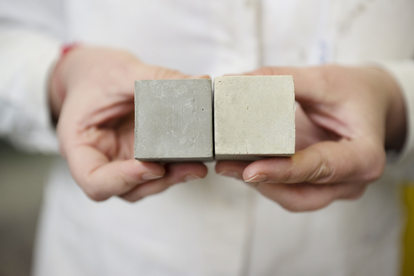 Noch können die Probekörper aus Recyclingmaterial (rechts) nicht mit herkömmlichem Zement mithalten (links): Grobe Poren und mangelnde Festigkeit machen den Forschenden zu schaffen. | © Bettina Engel-Albustin