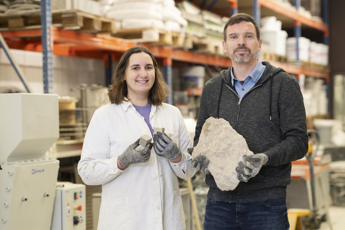 Anne Zora Gierth zeigt die ersten recycelten Probekörper, ihr Kollege Dr. Tommy Mielke hält ein Fragment der Brückentrümmer, aus denen es entstanden ist. | © Bettina Engel-Albustin