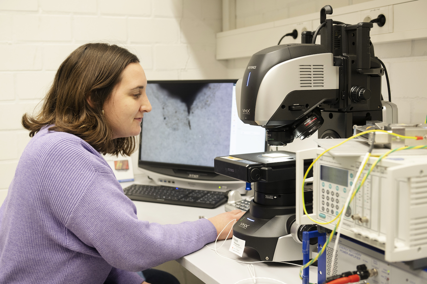 Wie entsteht der Riss? Anne Zora Gierth untersucht einen Probekörper unter dem Lichtmikroskop. | © Bettina Engel-Albustin